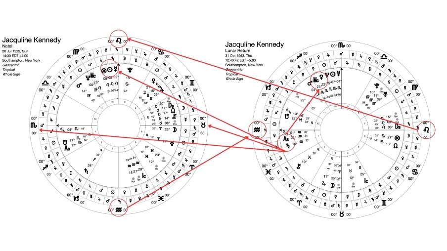U novembru 1963. godine, postaje udovica, nakon što je izvršen atentat na Džona Kenedija, a u toj godini profekcija se nalazi u znaku Djevice, gdje imamo postavljenog Marsa koji aktivira natalnu priču sa Venerom i Saturnom (Mars 90 Venera, Venera 180 Saturn, Mars 90 Saturn) o kojoj sam prethodno pisao. Merkur kao Vladar godine (ujedno i triplicitetni vladar Venere) je spaljen i vladar je 8. znaka u radiksu. (označeno zelenom bojom) Ako se nađete u godini u kojoj se aktiviraju nepovoljni aspekti između malefika (ukoliko aspekt postoji u natalu), onda će to vrlo vjerovatno biti godina otežavajućih okolnosti.