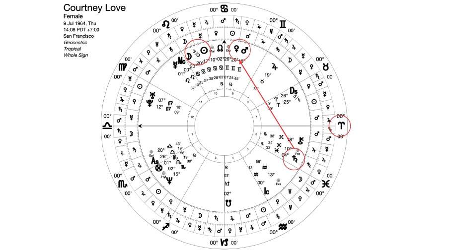 Međutim, Žaklina Kenedi nije sama u ovome. Kortni Lav, partnerka pokojnog Kurt Kobejna, takođe ima aspekt između Venere i Saturna, i to kvadrat retrogradne Venere iz znaka Blizanaca i Saturna u znaku Riba. Njena ljubavna priča sa Kobejnom počinje u godini kada profekcija pada u znak Škorpije, dovodeći Marsa u prvi plan kao Vladara godine. Mars je u konjunkciji sa Venerom i ujedno je vladar 7. znaka u natalu. Savez Venere i Marsa govori o izuzetno strastvenim odnosima u kojima je nerijetko zastupljena i konfliktna atmosfera, kao i „požari“ koje osoba mora gasiti tokom života na ljubavnom planu. Kortni je rođena na lunaciju – Mlad Mjesec koji takođe nije povoljan ukoliko govorimo o partnerstvima, a dodatno, Mjesec je vladar Arapske Tačke braka koja se nalazi na 10.28 Raka.