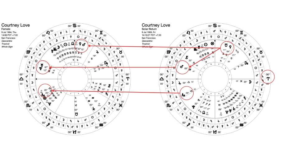 U aprilu 1994. godine, Kobejn je izvršio samoubistvo u svom domu u Sijetlu, a u revoluciji za tu godinu, njen ASC karte Solarnog povratka je postavljen egzaktno na natalnu poziciju ASC, što govori o jednoj važnoj godini, dok je vladarka SR ASC, Venera u povratku na natalnu poziciju u znaku Blizanaca i pravi aplikacioni kvadrat sa Marsom u 12. znaku, koji je ujedno i vladar 7. znaka, dakle predstavlja partnera u njenoj karti. SR Mars se nalazi jako blizu radiks pozicije Urana na 07 Djevice, sve u 12. znaku, oslikavajući zaista šok i iznenađenje koje se odnosi na partnera, kao i na odnos, te razbijajući viziju sna koji se na kraju nije ostvario. (Upliv Urana, Neptuna i Plutona se može uzeti u obzir ukoliko su u konjunkciji ili opoziciji sa relevantnim planetama, u vrlo uskom orbisu do 3º)