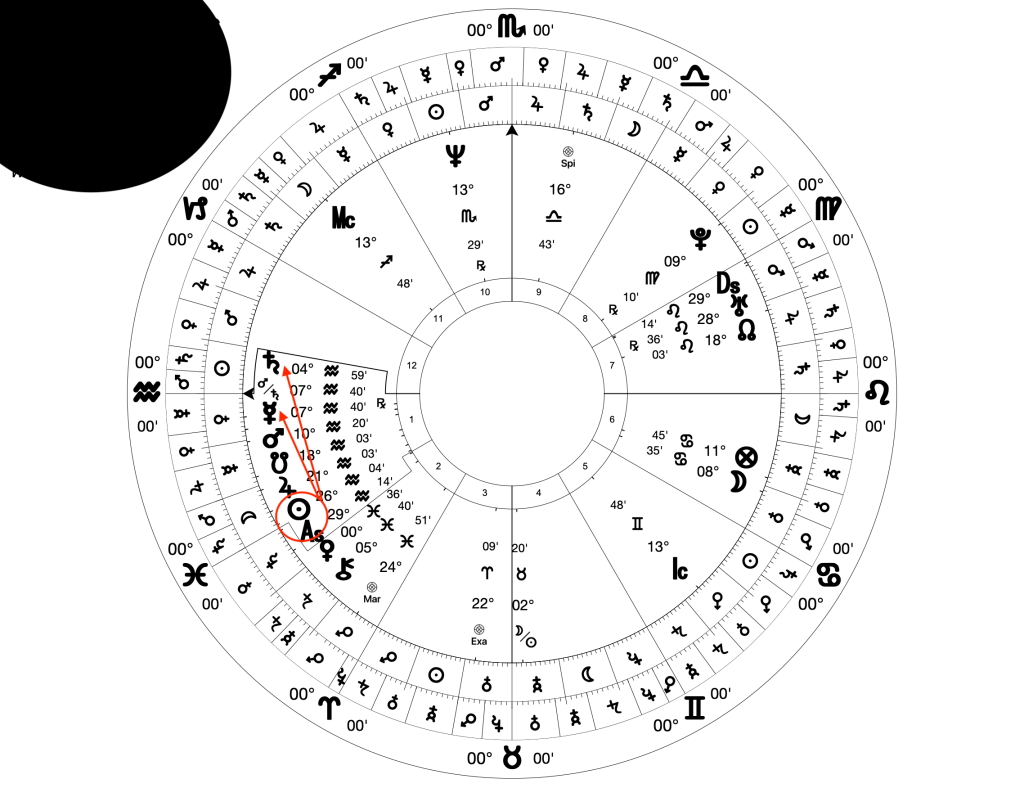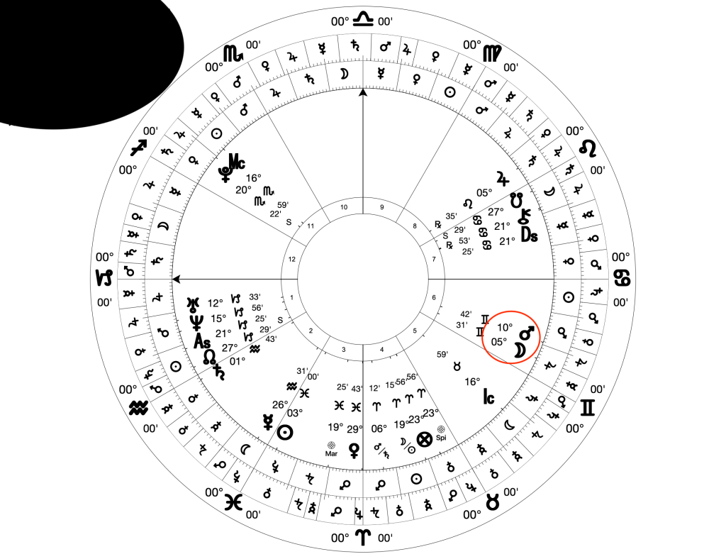 U ovom primjeru, imamo noćno rođenje (SO u 3. znaku) pa je dominantno svjetlo Mjesec, a u sekti se nalaze Venera i Mars. Mars se nalazi na kasnijim stepenima u odnosu na Mjesec, u orbisu od dozvoljenih 7º u okviru istog znaka, što ga čini kopljonošom Mjeseca. U konkretnom primjeru, poželjno bi bilo da se Mjesec nalazi na uglu u odnosu na ASC, što ovdje nije slučaj, jer se nalazi u 6. znaku.